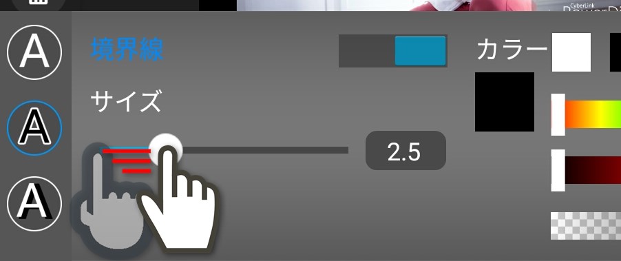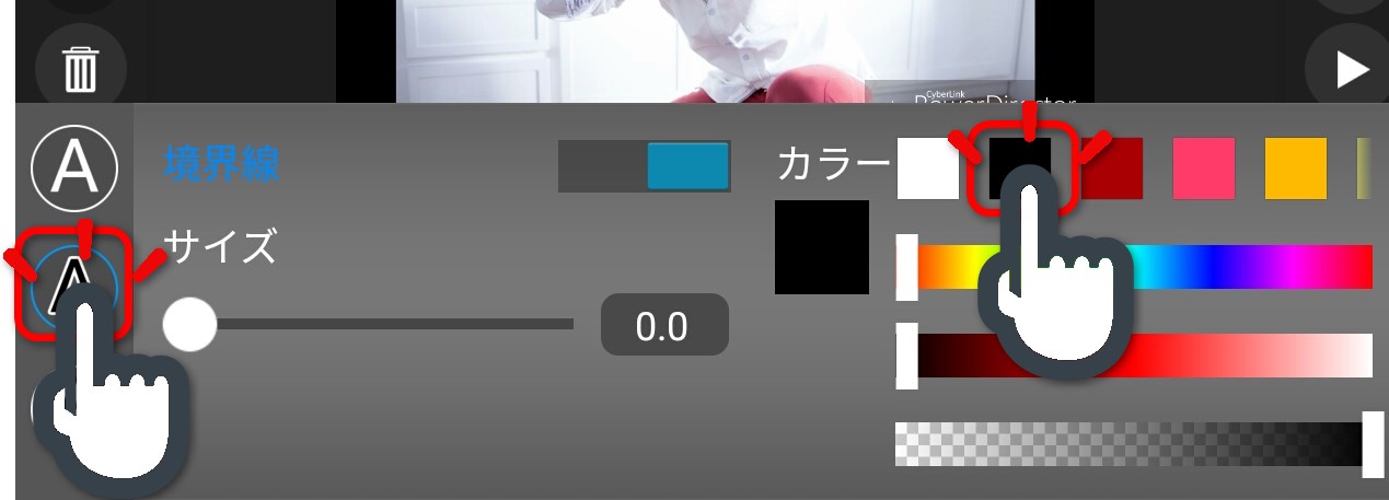 左の中段のAアイコンをタップしてから、右の「カラー」のブラックをタップ